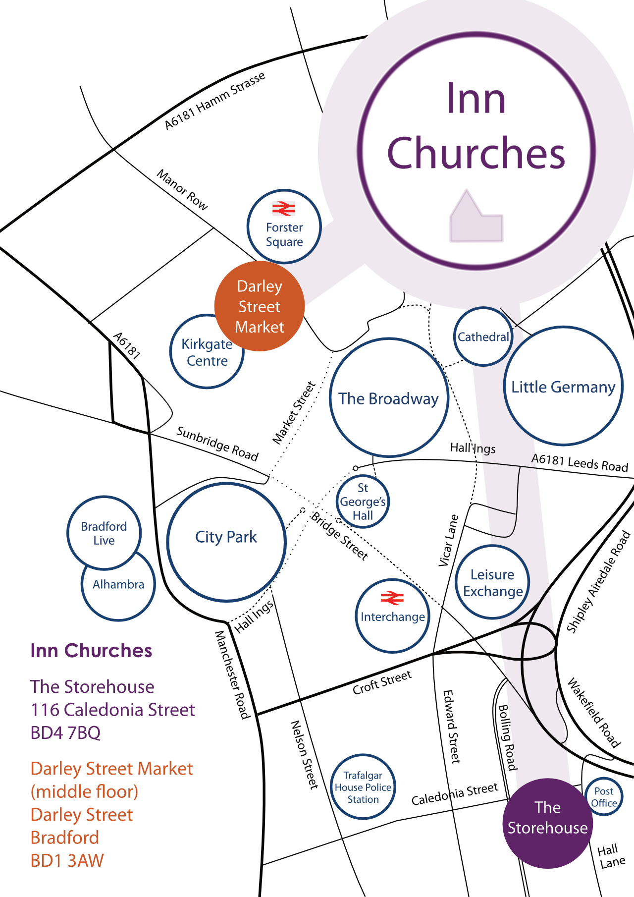 The Storehouse is located just south of Bradford city centre, near the main police station, just off the junction of Wakefield Road, the Shipley Airedale Road and Croft Street.